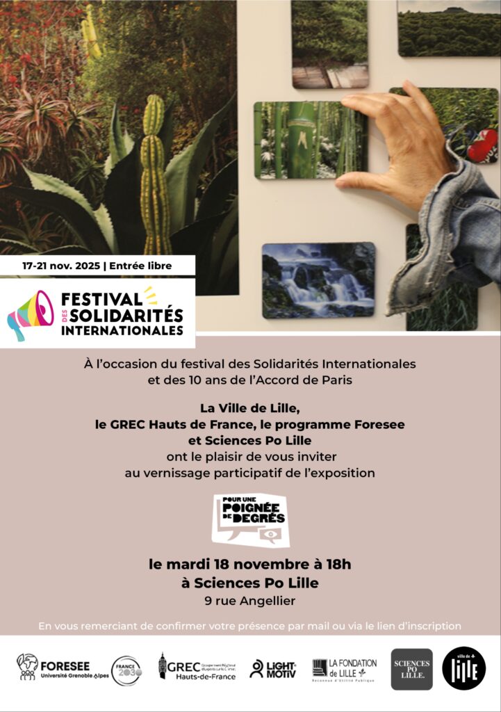 - une dimension artistique, avec une exposition intitulée « Pour une poignée de degrés ». Créée il y a 10 ans à l’occasion de la COP 21 par Light Motiv et la MRES, l’exposition a été complétée pour l’occasion et sera exposée dans sa version magnétique, qui permet d’en avoir une approche personnelle, subjective et participative. L’exposition sera installée à Sciences Po Lille du 17 (après-midi) au 21 novembre (détails ici). Vernissage participatif le 18 novembre à 18h (inscription ici. Deux séances de médiation ouvertes au grand public se tiendront le 20 novembre (14h30-16h30 et 17h-19h, détails et inscription ici).